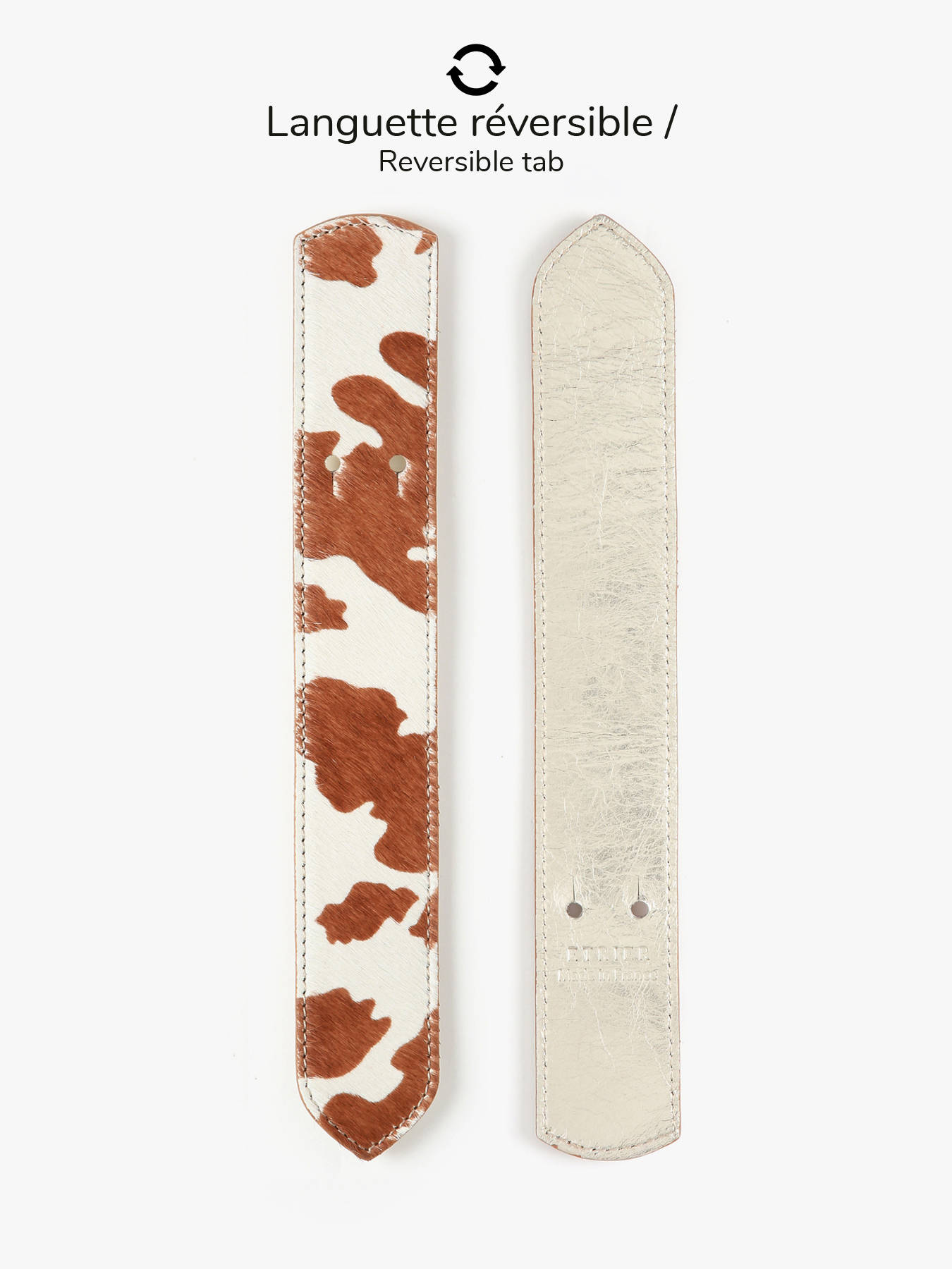 Het ETRIER-riempje zorgt voor een elegante personalisatie van uw tassen. Omkeerbaar en vervaardigd in Frankrijk, onderscheidt deze riempje zich door het in reliëf aangebrachte ETRIER-detail. Verkrijgbaar in vier trendy dierenmotieven – koe, cheeta, luipaard en zebra – geeft ze een unieke en originele vleugje aan uw Agnès-tas. Perfect om van de ene stijl naar de andere over te gaan en om uw persoonlijkheid te benadrukken.