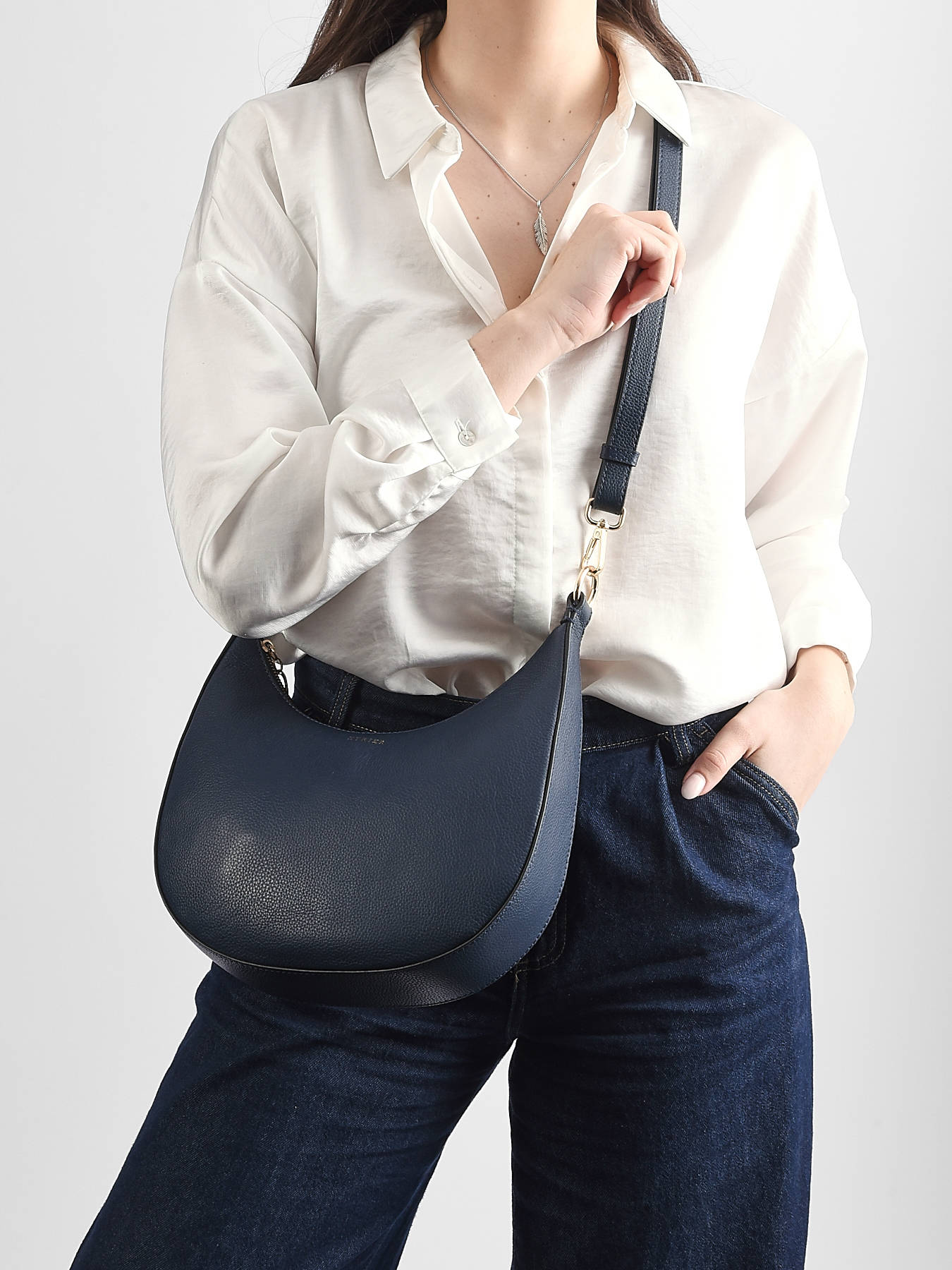 Deze nieuwe vorm van de iconische TRADITION lijn van ETRIER betovert met zijn halfmaan-ontwerp, dat een ruime opbergruimte biedt terwijl het een elegante en moderne uitstraling behoudt. Perfect voor actieve vrouwen, combineert deze tas functionaliteit met verfijning. De gouden sieraden en het stijgbeugel op de rits trekken de kenmerkende codes van de TRADITION collectie aan, waardoor dit tijdloze model een verfijnde toets krijgt. Binnenin vind je een eenvoudig vak en een ritsvak om je essentials te organiseren, terwijl het middelgrote formaat je in staat stelt om je dagelijkse benodigdheden gemakkelijk mee te nemen. Met de afneembare en verstelbare schouderriem past deze tas zich aan al je wensen aan: over de schouder voor een casual look of schuin voor een praktischer uiterlijk. Het zorgvuldige ontwerp en het minimalistische ontwerp maken het een onmisbare keuze voor wie op zoek is naar een elegante en ruime tas, zonder concessies te doen aan de stijl. De halfmaan-tas van de TRADITION lijn van ETRIER, een accessoire dat is ontworpen om je dagelijks elegant te begeleiden.