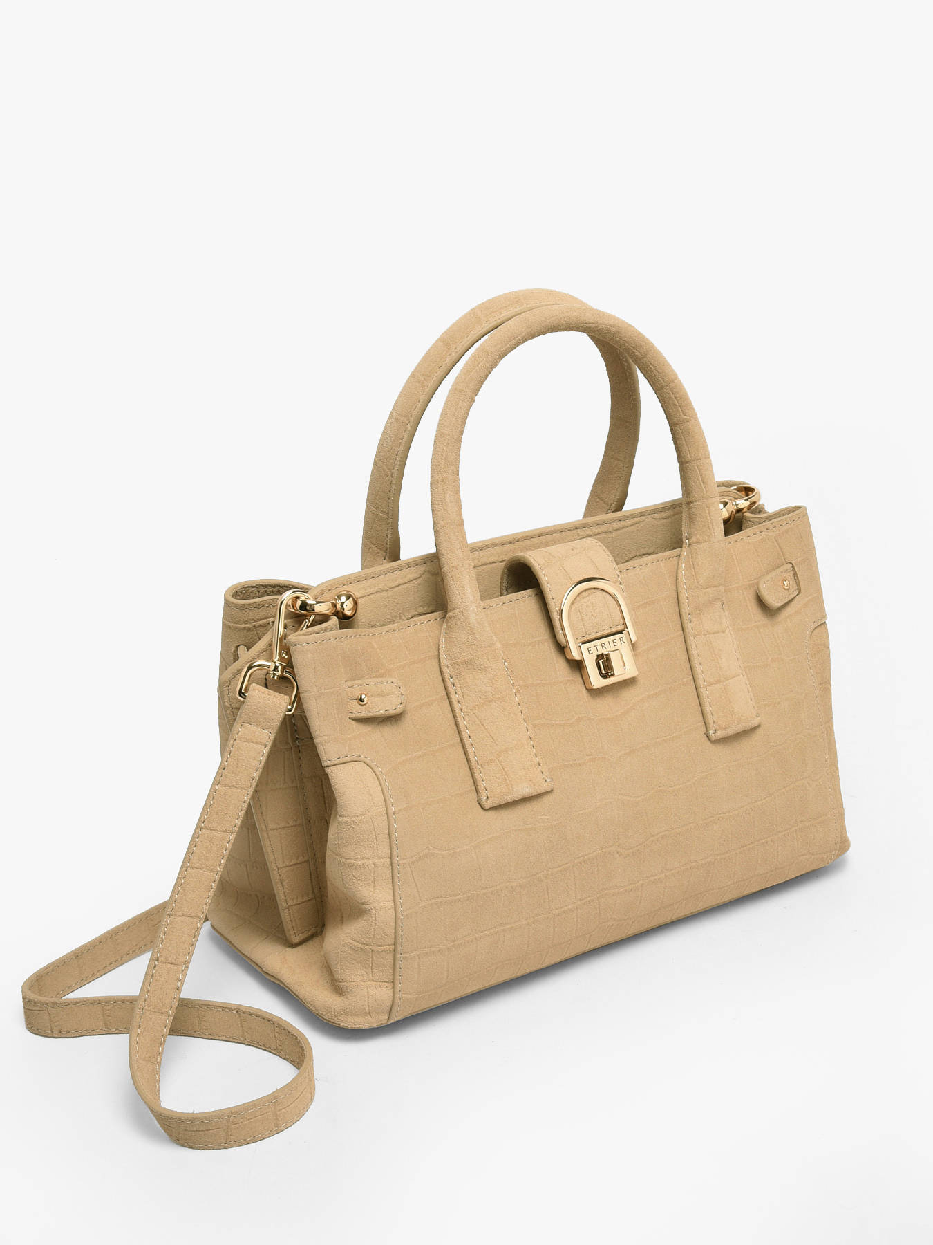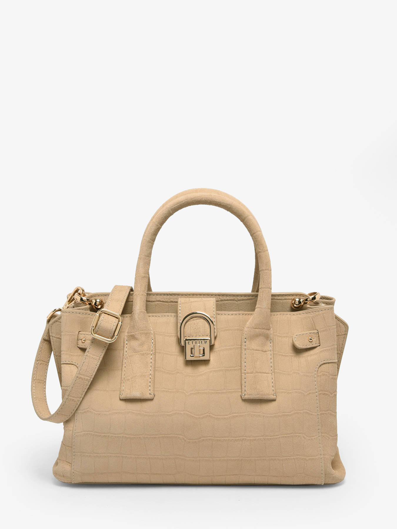 De handtas EQUESTRE CROCO van Etrier, in compact en verfijnd formaat, is vervaardigd uit suède rundleer met krokodillenprint. Deze gedurfde mix van texturen geeft een verfijnde uitstraling en wilde charme, kenmerkend voor de Equestre-lijn. Hij sluit met een ritssluiting, een flap en een sluiting, wat elegantie en veiligheid garandeert. De hoogte van het handvat is 12 cm en de tas is voorzien van een verstelbare en afneembare schouderriem voor een veelzijdige draagwijze, in de hand of als cross body tas. Binnenin vergemakkelijken twee compartimenten, samen met twee steekvakken en een ritsvak, de organisatie van uw essentials. De gouden afwerkingen geven dit compacte model een verfijnde vleugje. Deze tas is ook verkrijgbaar in maat M, voor meer ruimte indien gewenst.