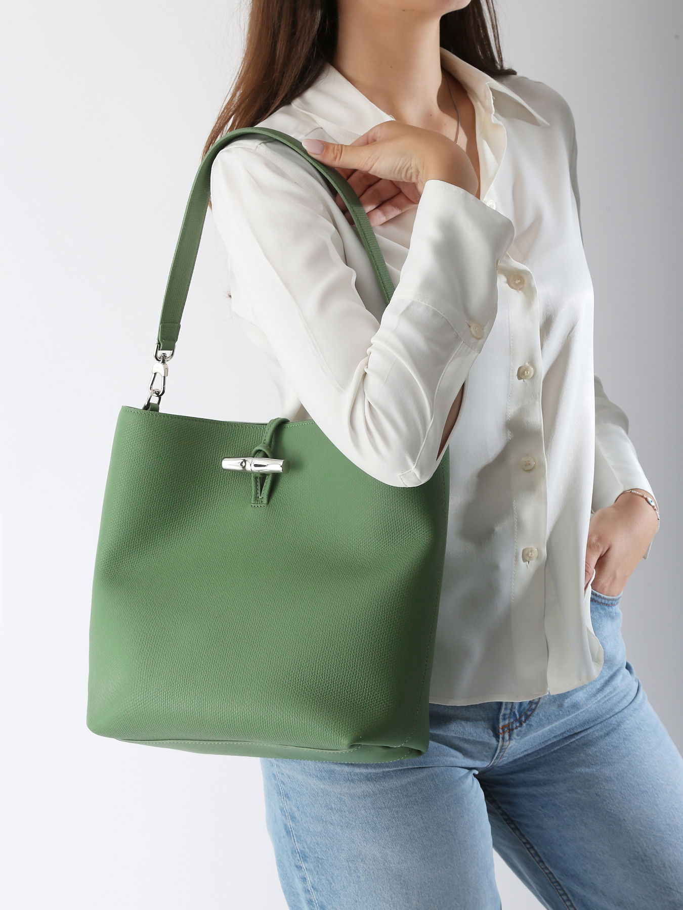 Deze schoudertas M van gegrifd rundsleer combineert elegantie en functionaliteit met zijn strakke lijnen en voldoende ruimte voor een 13-inch laptop, een boek en je dagelijkse essentials. De iconische bamboesluiting, het echte handelsmerk van de Roseau-lijn, voegt een kostbare en vrouwelijke toets toe, waardoor deze tas een verfijnd en tijdloos stuk wordt. Het zachte leer dat met de tijd patineert en mooier wordt, benadrukt het ambachtelijke vakmanschap van Longchamp en maakt deze tas tot een ideale metgezel voor een chique dagelijkse stijl.
